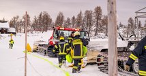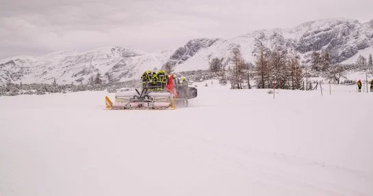 Um 16:00 Uhr ging es los. Da unsere schweren Löschfahrzeuge im tiefen Schnee nicht bis ganz nach oben kommen, endete die Fahrt für uns zunächst bei der Mittelstation auf den Hutterer Böden. Ab hier hieß es: Umsteigen. Dank der großartigen Unterstützung durch die Bergbahnen standen zwei Pistengeräte und ein Skidoo bereit.