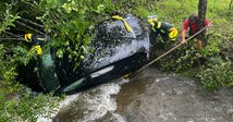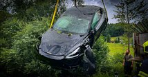 Ein spektakulärer Verkehrsunfall ereignete sich am Dienstagvormittag auf der Vorderstoderlandestraße L551: Aus bislang unbekannter Ursache kam ein Fahrzeug mit Elektroantrieb von der Straße ab, schlitterte über eine angrenzende Wiese, durchbrach einen Weidezaun und kam schließlich mit der Fahrzeugfront im Bachbett der Loigis zum Stillstand.